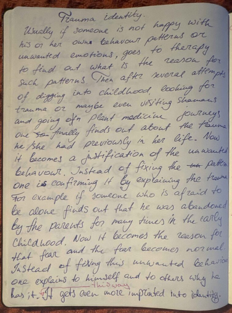 Usually, when someone is unhappy with their own behaviour patterns or recurring unwanted emotions, they eventually end up in therapy, hoping to discover why these patterns exist. After several rounds of inner digging—exploring childhood memories, searching for trauma, maybe even visiting shamans or going on plant-medicine journeys—one finally uncovers a story that seems to explain it all.
